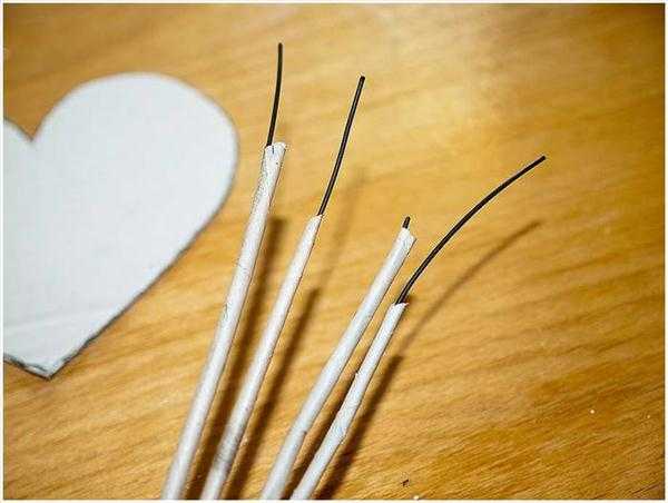 Палочки от мороженого окрашиваем белой краской, после чего приклеиваем их к консервной банке. Проволоки, на которых держится сердце, обматываем джутовой нитью так, чтобы концы проволоки остались оголенными.