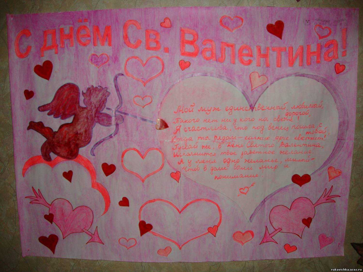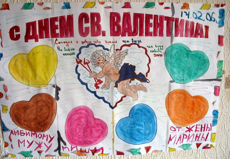 - На уже наклеенной валентинке всегда можно написать какое-то красивое напутствующее послание для своей второй половинки. По периметру плаката или под каждым фото можно написать так же подходящие четверостишия.