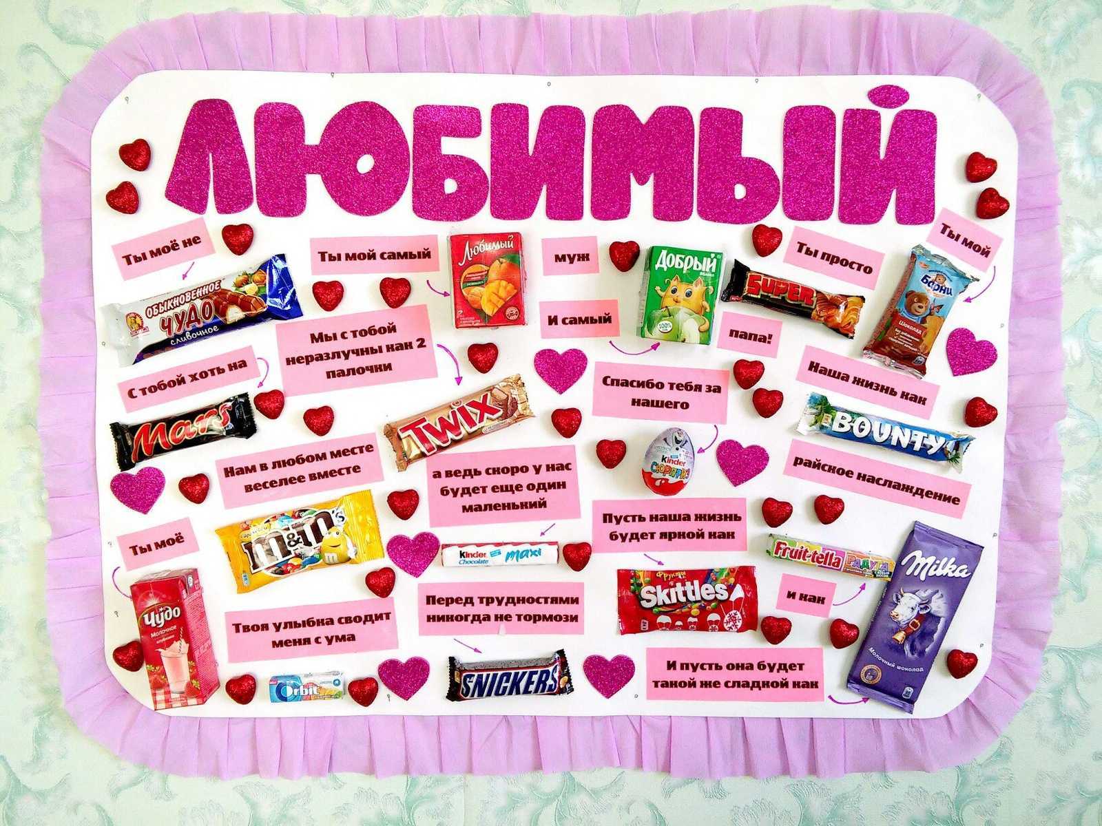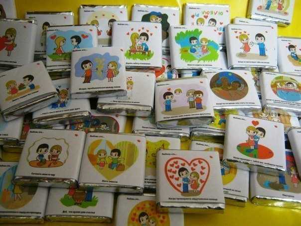 Сладкий подарок, оформленный , придется по вкусу всем сладкоежкам. Для его изготовления потребуются вкладыши из-под жевательной резинки «Love is…», которые содержат серьезные и шуточные выражения о любви. Можно заранее купить нужное количество жевательной резинки и вынуть из них вкладыши или найти в интернете понравившиеся шаблоны и распечатать на цветном принтере. Если вы хорошо владеете компьютером, то на обертку можно нанести собственные выражения, пожелания или признания в любви.