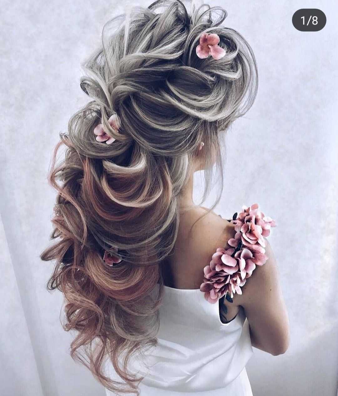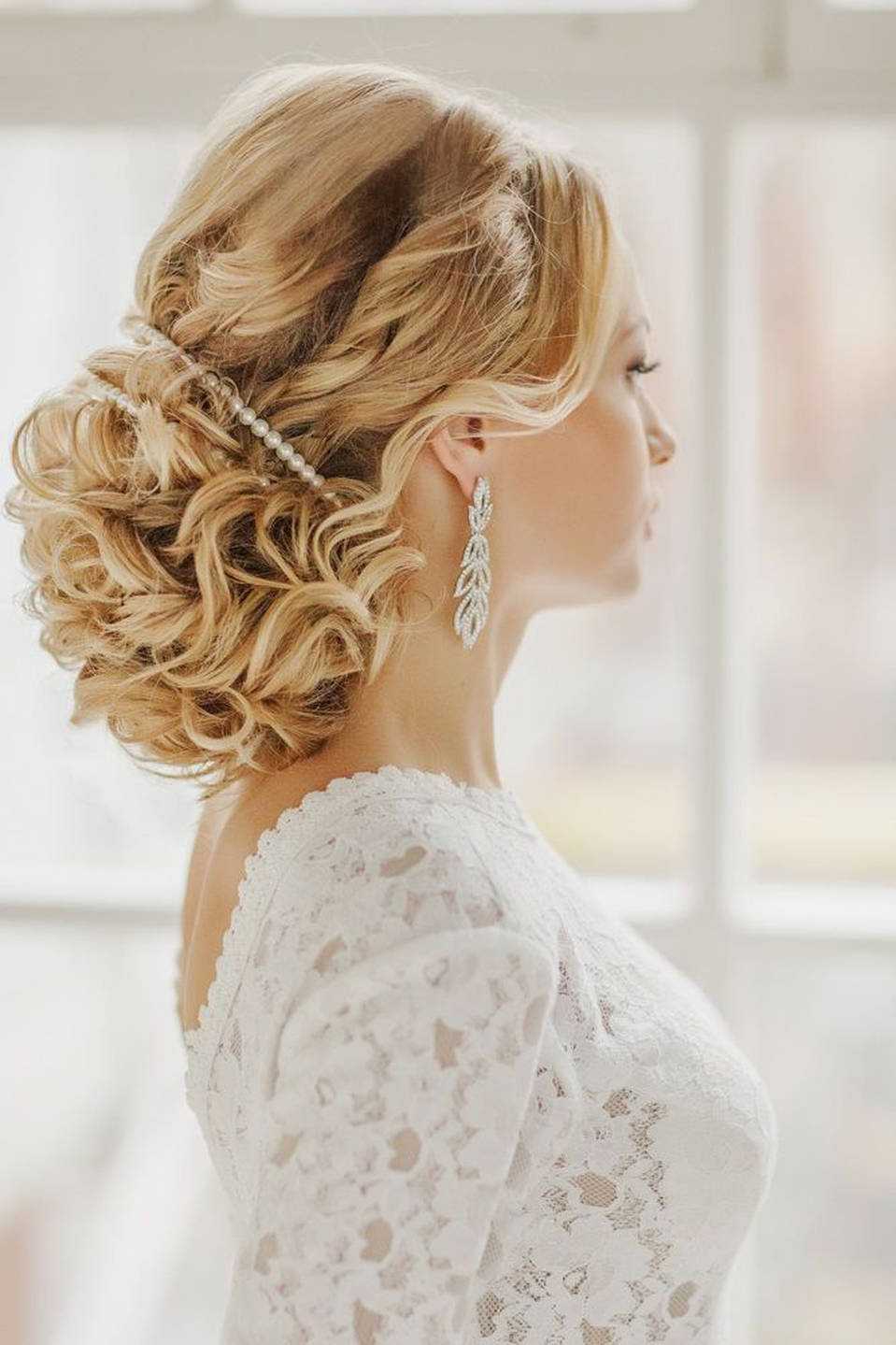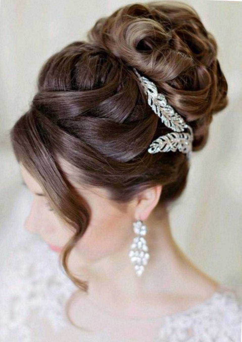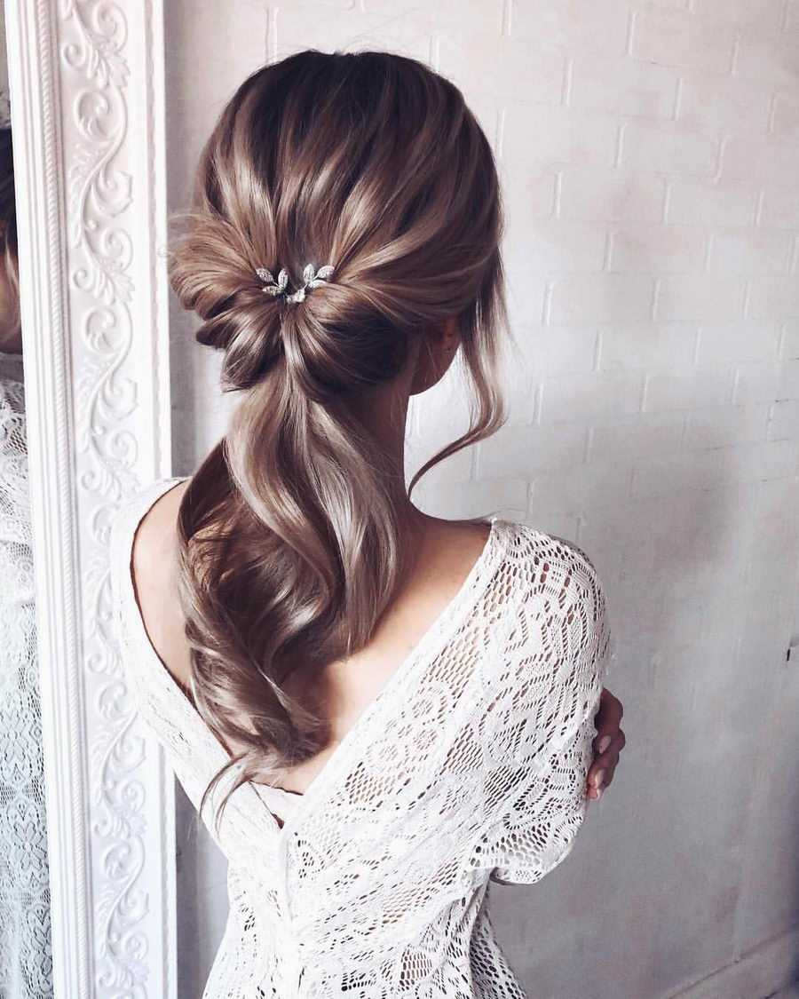 Оказывается, что таких видов причесок очень много. Часто применяется прическа для свадьбы с челкой, на основе слегка приподнятых волос и удобно сложенных в районе макушки локонов, идеальной формы «конского» хвоста, широко распущенной версии с использованием мелких кудрей.