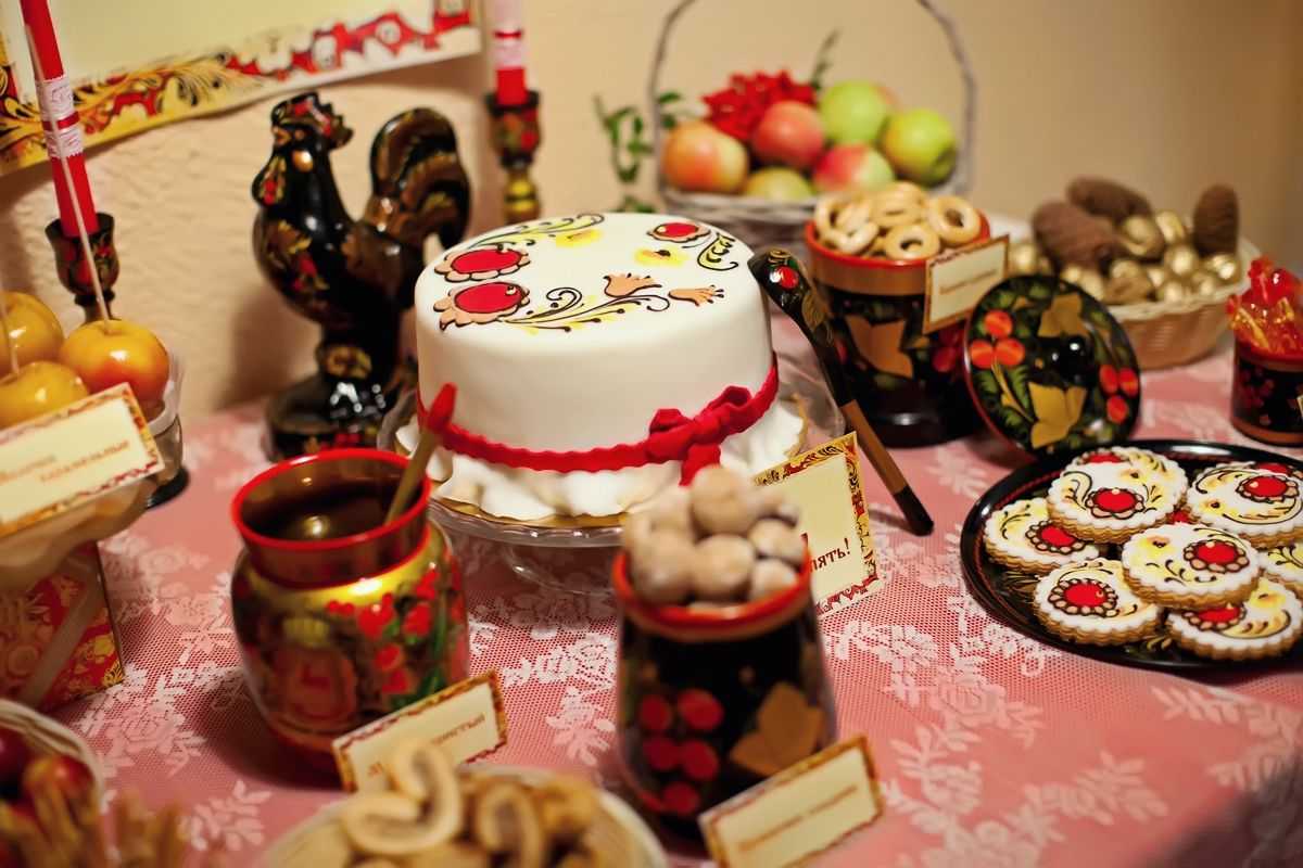 - Сладкие блюда: ягоды, повидло или варенье, пирожки, ватрушки, кулебяки, блины с разными начинками и оладьи, бублики. Если вы отмечаете День рождения, то даже торт можно сделать в русском народном стиле, украсив его тематическими фигурками или выполнив под хохлому или гжель.