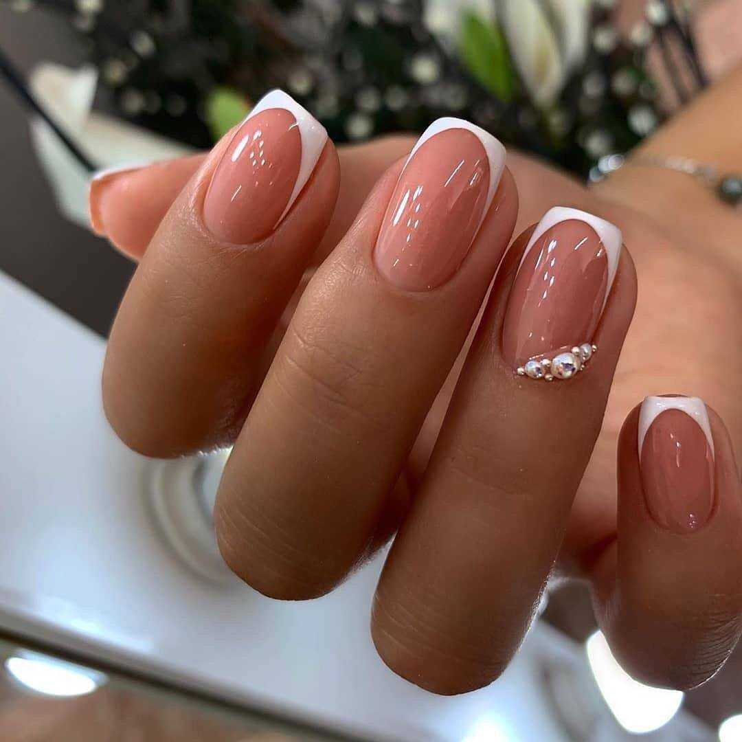 Французский маникюр — это вечная классика. Выбирая дизайн ногтей на Новый год, его можно дополнять рисунками из блесток, пайетками, стразами.