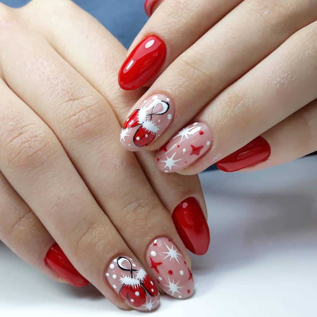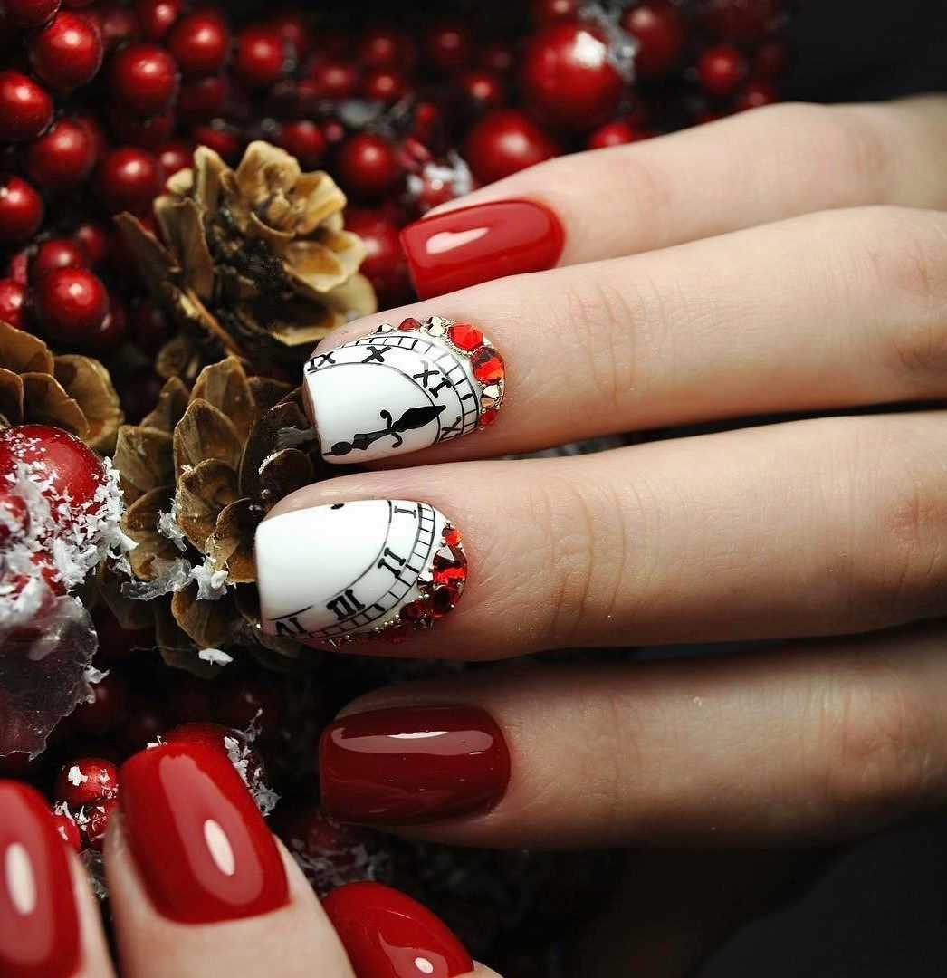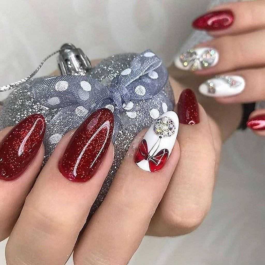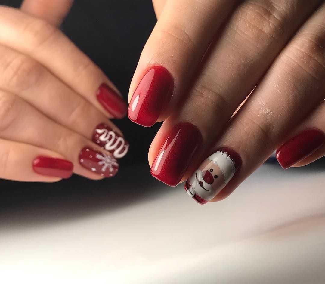 Обрати внимание, что новогодний маникюр на короткие ногти также может быть максимально разнообразным не только по цветам, но и по форме — умелые мастера маникюра сумеют придать и округлую, и овальную, и квадратную форму коротким ноготкам — вот только модный заостренный кончик на них, скорее всего, будет смотреться странно. Но в целом у тебя будет огромный выбор!