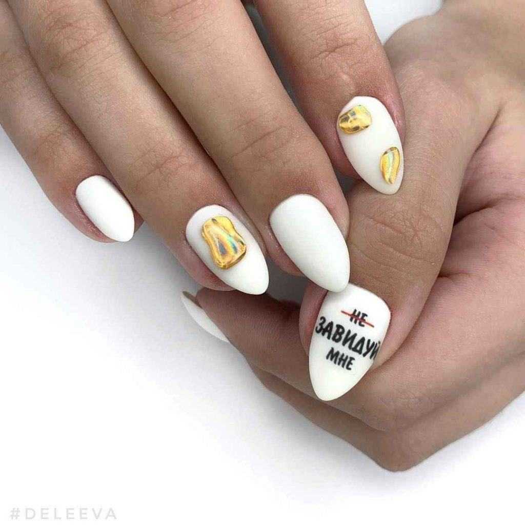 Также стоит рассматривать градиент с прозрачным лаком, мраморный маникюр, не золотой, а серебряный декор, который смотрится менее экстравагантно.