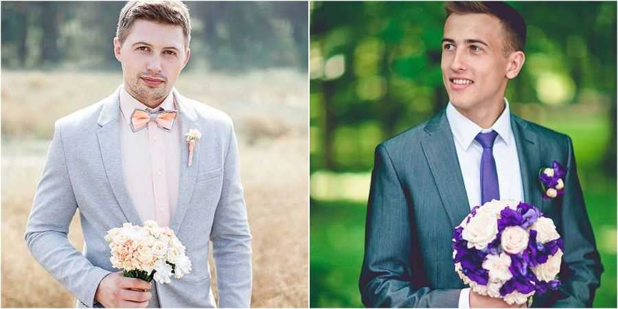 Доходит до смешного: вы можете пролистывать сотни фото с таких разных свадеб, но везде видеть будто один и тот же синий костюм на женихе! Цвету костюма нужно уделить особое внимание, если основой вашей свадебной концепции является определённая палитра. К примеру, к розовой палитре синий совершенно не подойдёт, а вот серо-голубой придётся весьма кстати