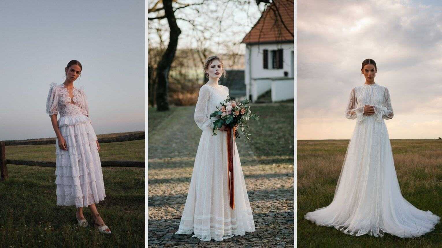 Выбирая образ невесты для свадьбы, следует сразу отказаться от белоснежных пышных нарядов с кринолином, дорогих шелков и атласа — это будет выглядеть неуместно. Выберите платье из натуральных тканей, с пышными рукавами, возможен вариант наряда с завышенной талией. Также платье может быть украшено красивой вышивкой, нежными ажурными кружевами. Макияж сделайте в стиле ньюд — естественный тон, светлые губы, лишь слегка подчеркнутые глаза. Что касается прически, избегайте высоких сложных конструкций. Пусть это будет небрежный пучок, распущенные завитые локоны, создающие эффект легкого беспорядка, милая мальвинка. На голову получится надеть венок из полевых трав, цветов — тех же, что есть в букете. В качестве обуви подойдут сандалии, удобные балетки, сапоги.