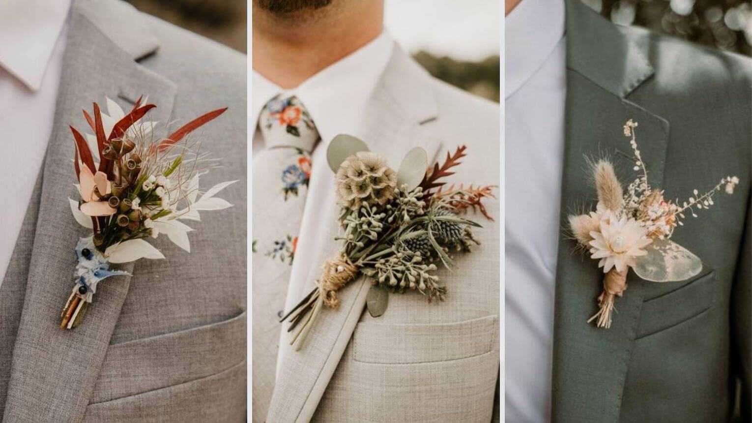 Бутоньерку, как и букет невесты, мы рекомендуем делать из полевых цветов и колосков или из перышек. Главное, чтобы растения в бутоньерке совпадали с растениями из букета невесты и были в единой концепции.