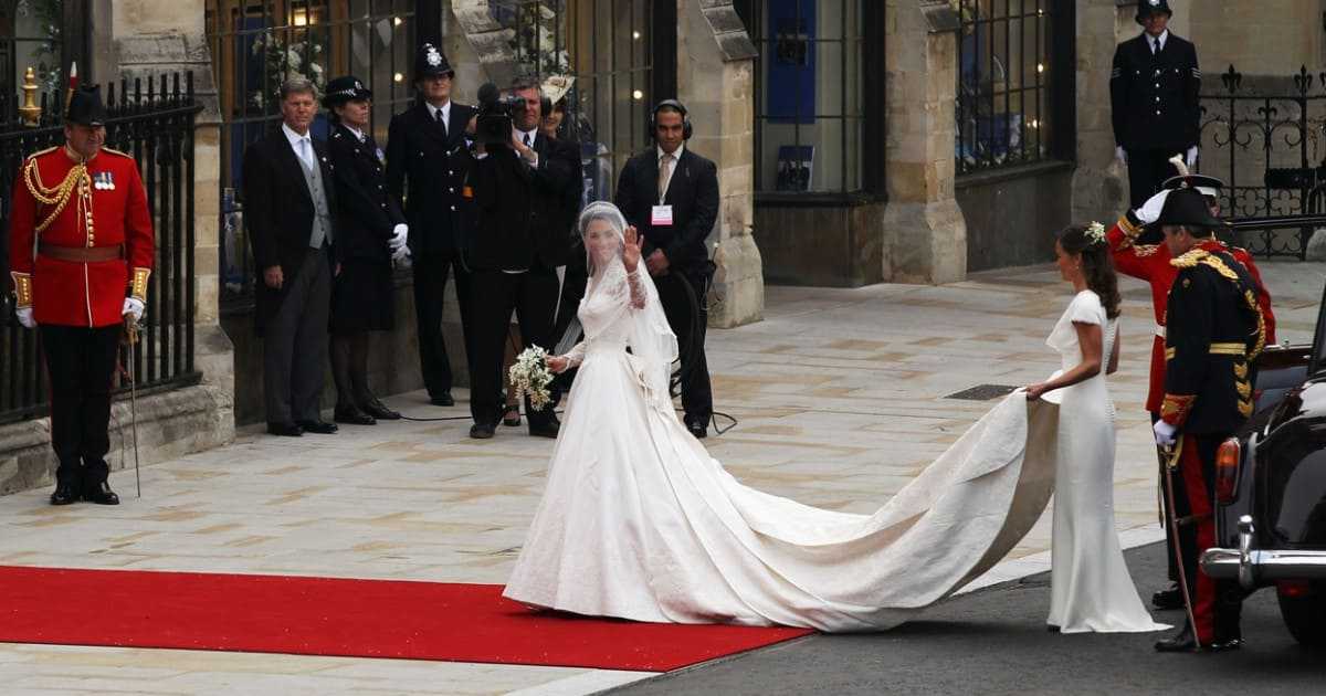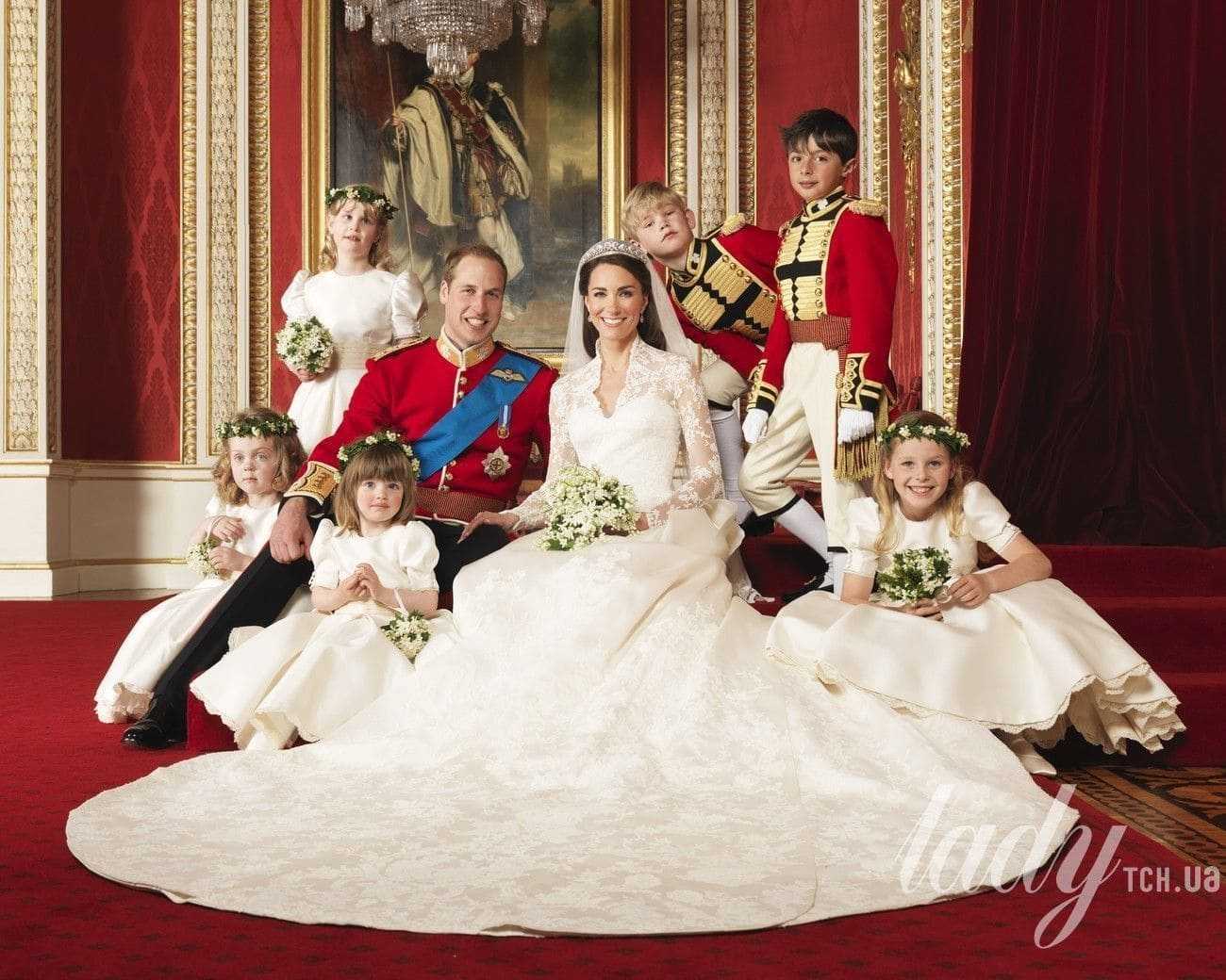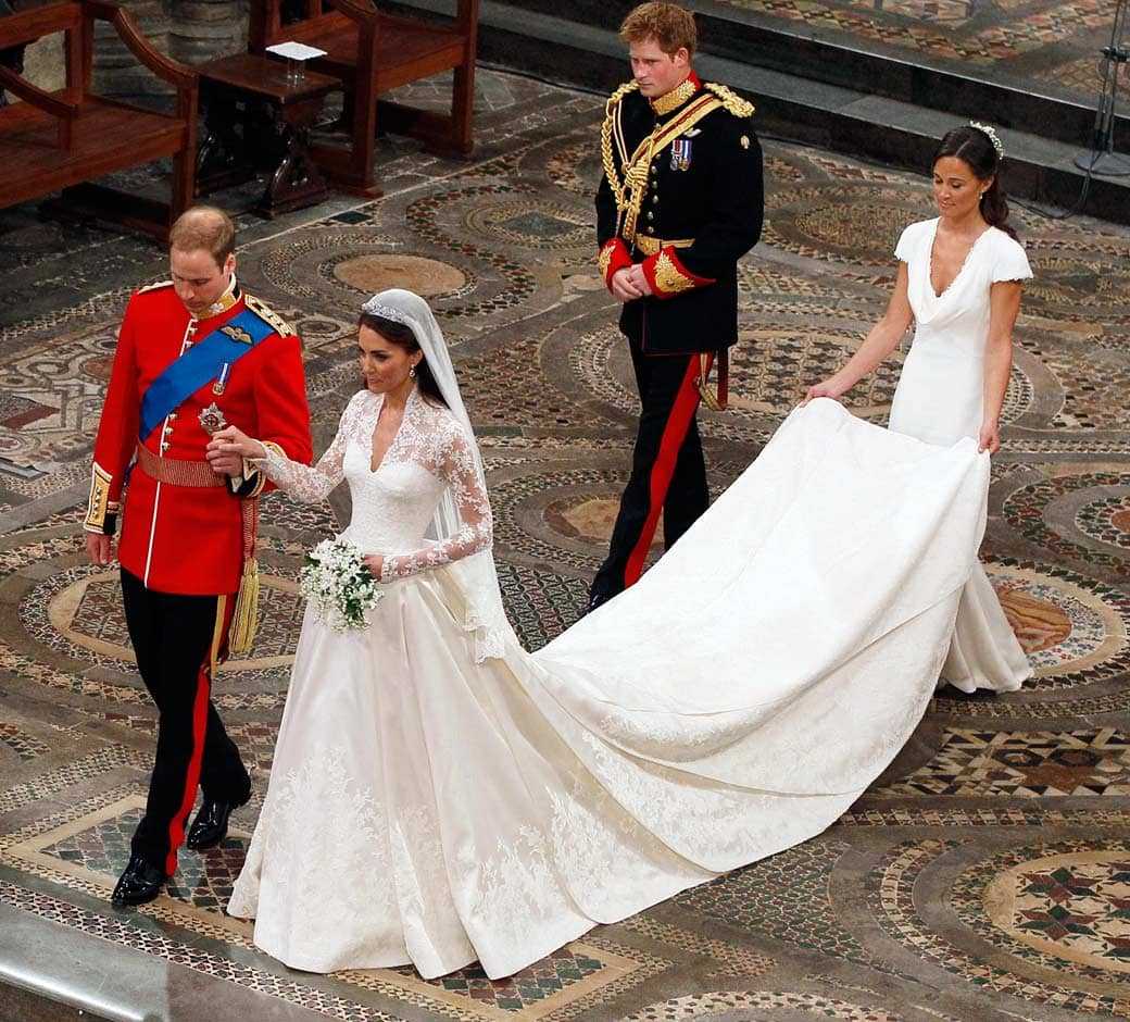 фунтов. Дизайном наряда Кейт Миддлтон стала Сара Бертон, креативный директор Alexander McQueen. Фата невесты имела длину 3 метра, поэтому будущей жене принца пришлось позвать на помощь сестру, которая помогала поддерживать и поправлять роскошный шлейф.