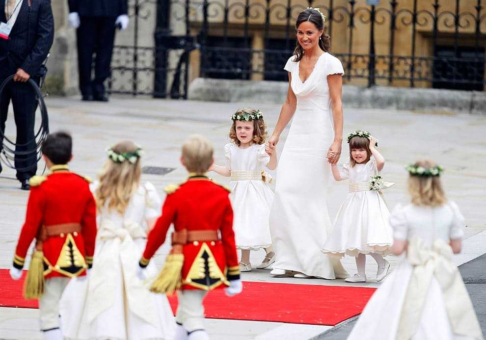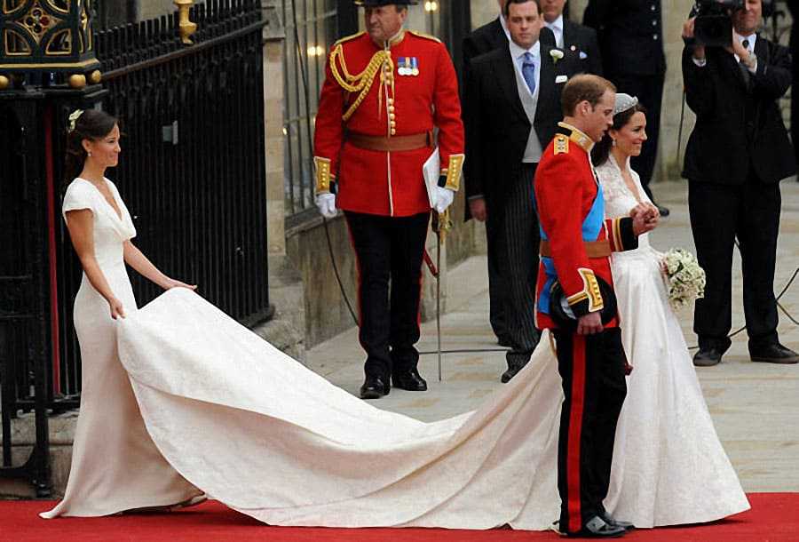 Подол платья несла младшая сестра невесты — Филиппа Шарлотта или просто Пиппа. Её формы на этой фотографии впоследствии ещё долго будоражили интернет
