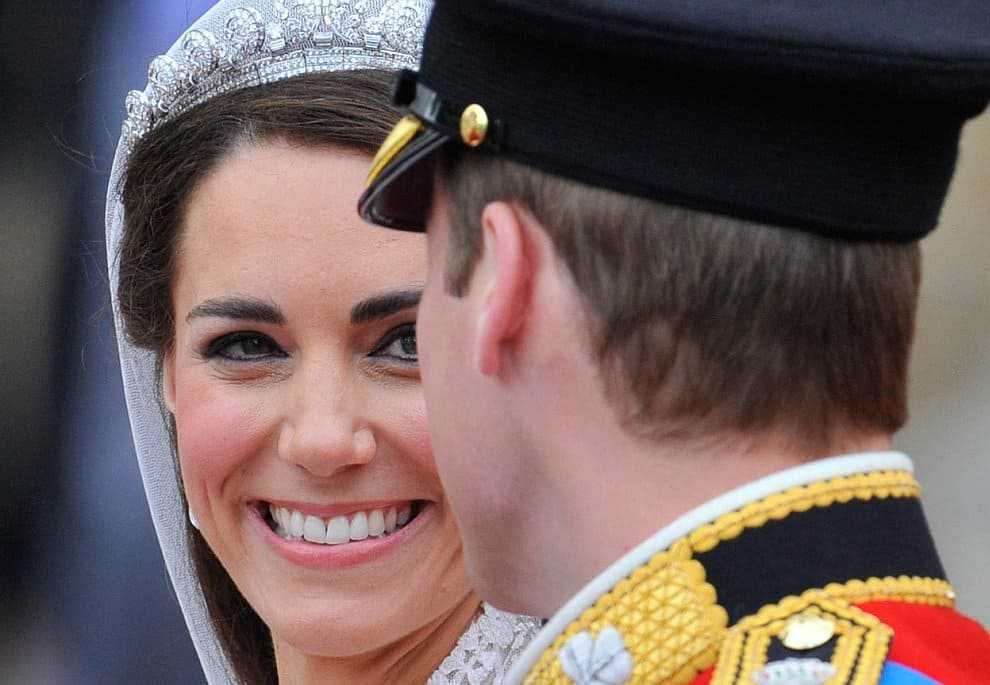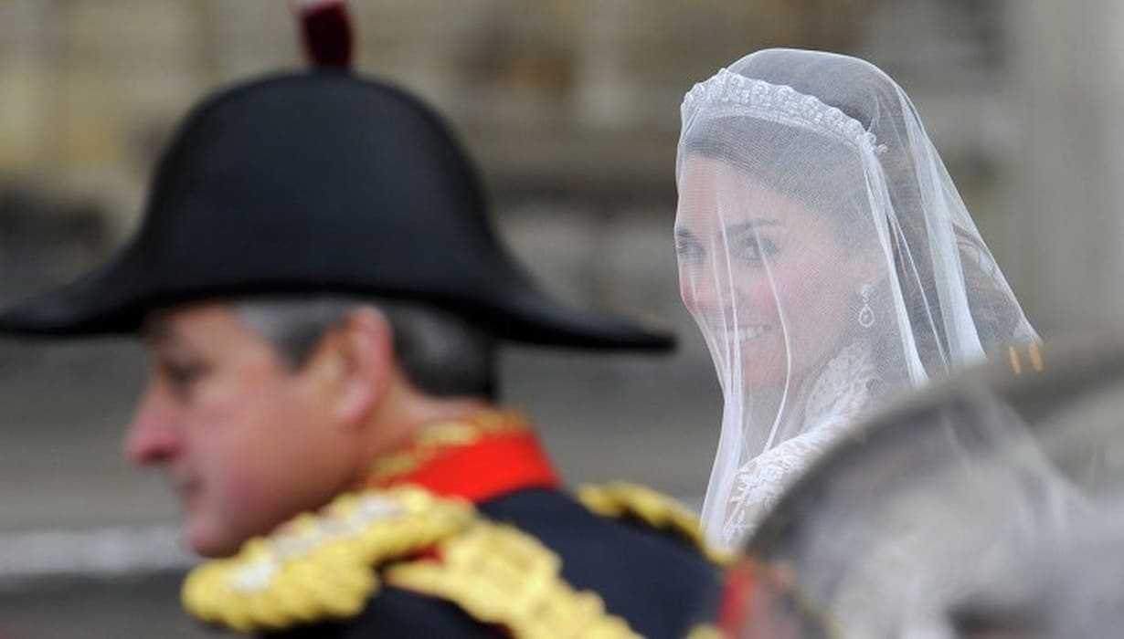 Кейт подходит к месту бракосочетания, её голова укрыта фатой. Также голову невесты украшает тиара Cartier, полученная ею лично от королевы Елизаветы II. Это старинное украшение, которое досталось самой королеве в возрасте 18 лет от её мамы.