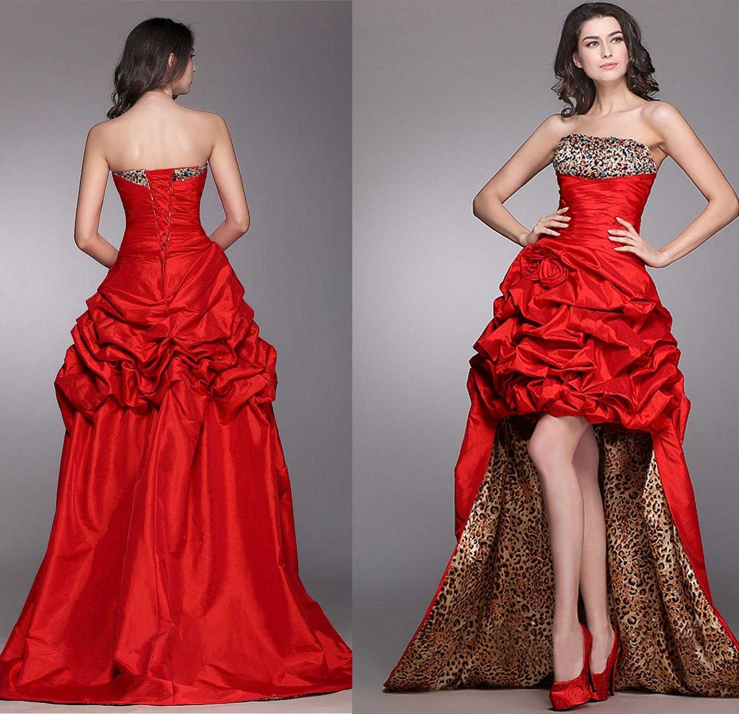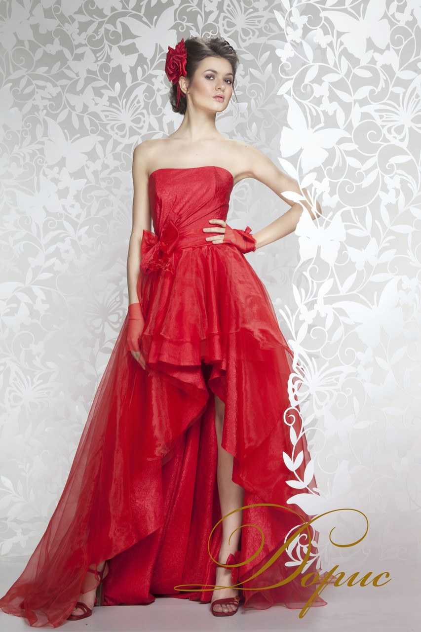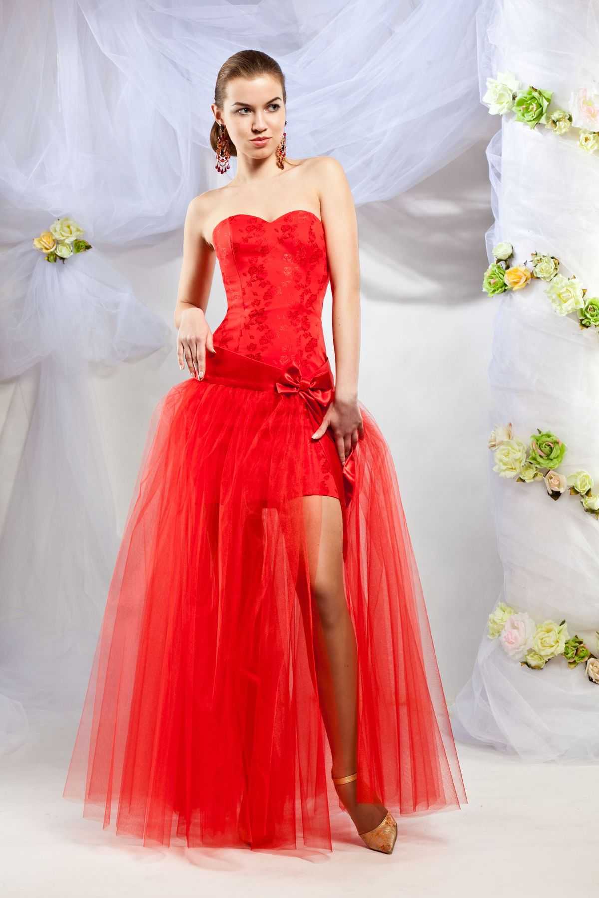 очень интересно смотрится красное платье с короткой юбкой спереди и длинным шлейфом сзади. Оно придает образу воздушность и оригинальность. Этот вариант подходит девушкам с длинными и стройными ногами.