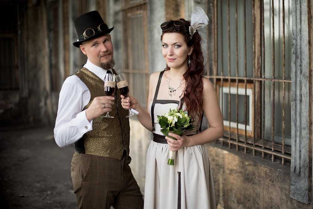 История стимпанка вызывает у молодоженов чувство ностальгии. Во времена Викторианской эпохи в моде были хорошие манеры и колоритные одеяния. Мужчины оставались верны своим принципам, а женщины всегда подчеркивали свою женственность и утонченность.
