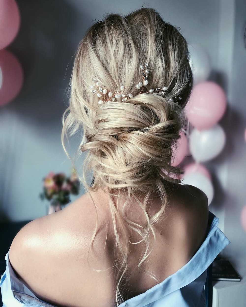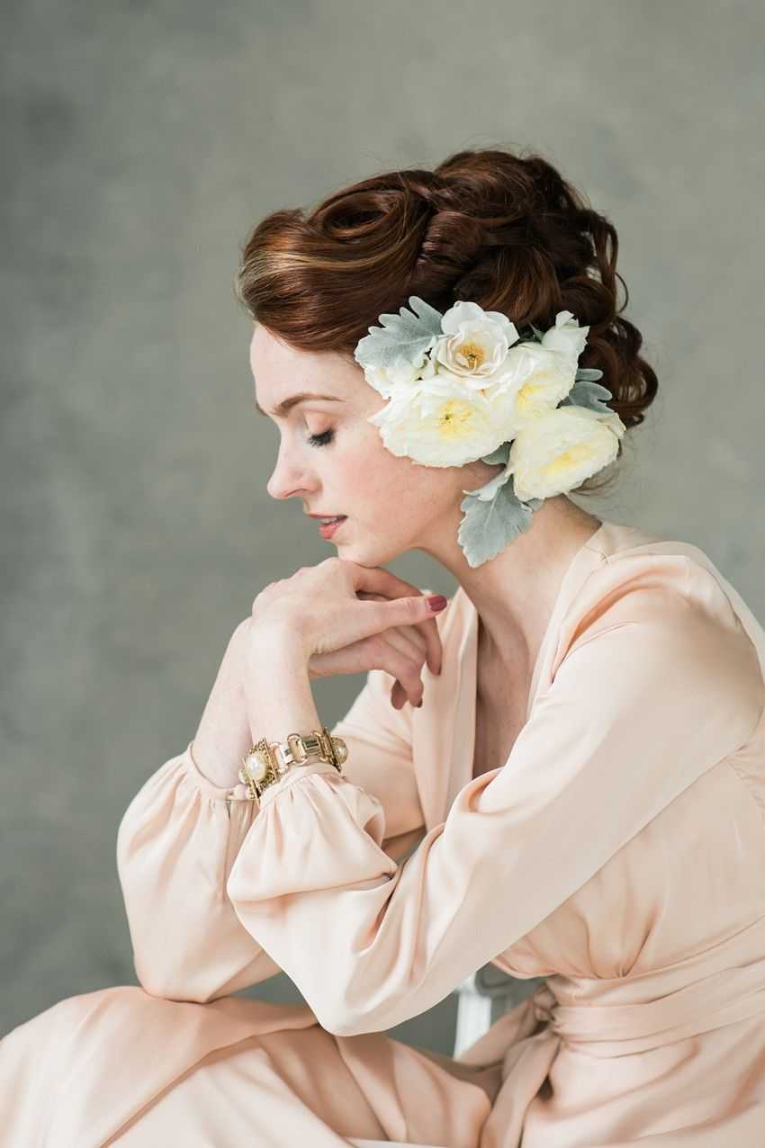 Небрежно собранные волосы, украшенные нежной заколкой с цветами смотрятся невинно и романтично Невесте с ярким макияжем достаточно освежить причёску лёгкой волной