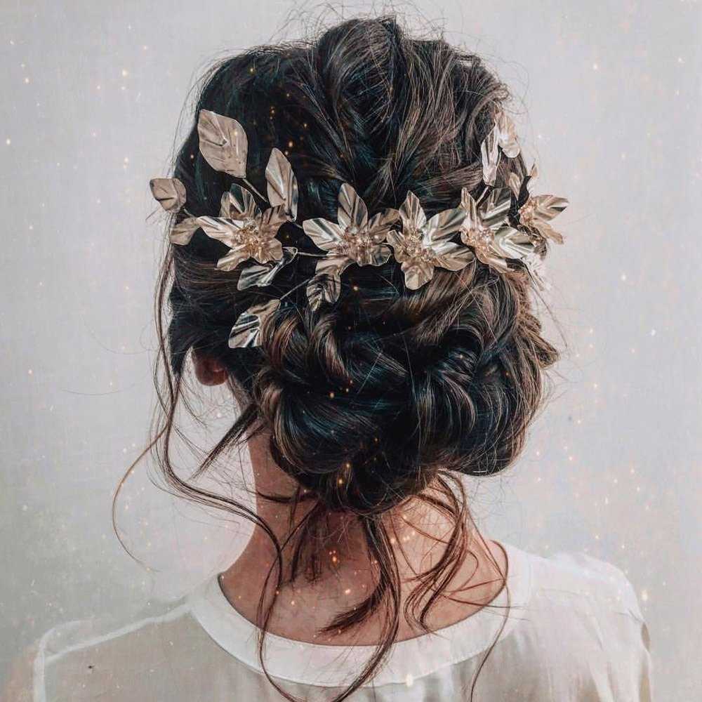 Эта необычная укладка дополнена нарядной заколкой-листиками со стразами. Элегантный пучок на затылке собран в красиво уложенные, замысловатые пряди. Укладка хорошо сочетается с платьем с одной бретелей. Она будет неплохо смотреться и с прозрачным, и с открытым декольте. А фасон наряда под эту укладку выбирайте любой.