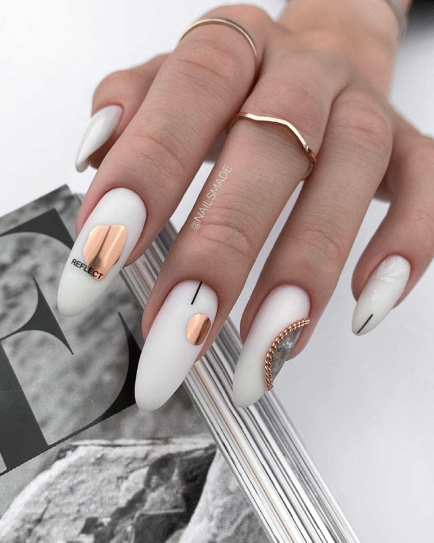- Лучше избегать типично “свадебных” дизайнов, таких как жемчужная втирка, френч или кружево.