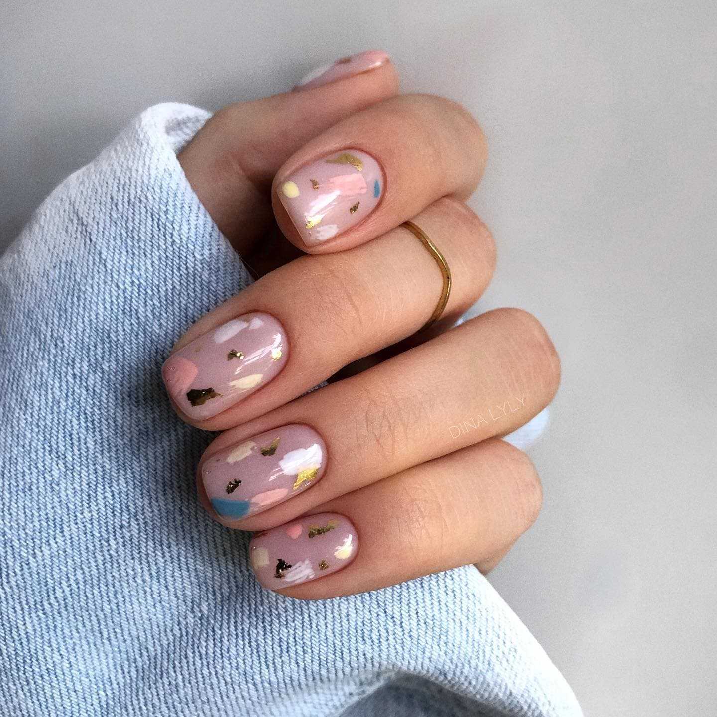 Кусочки блестящей однотонной, разноцветной или голографической фольги можно разрезать на любые кусочки. Форму кусочков стоит делать разную, что в итоге поможет создавать красивые узоры непохожие друг на друга.