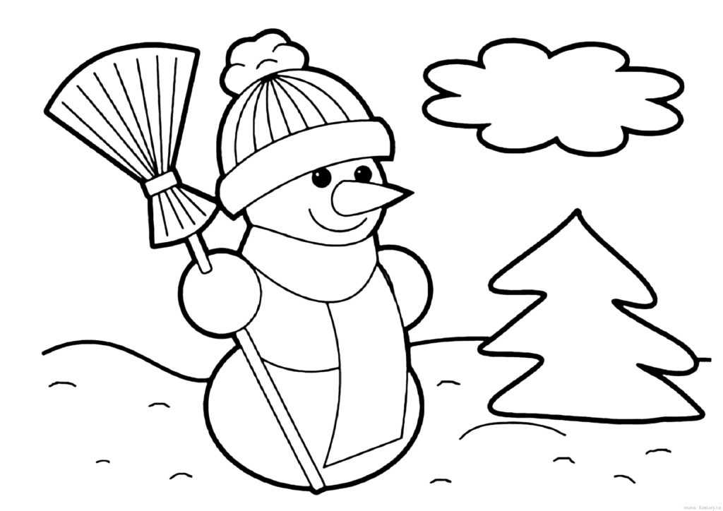 Снеговик на окно из бумаги — возле новогодней елки: трафарет