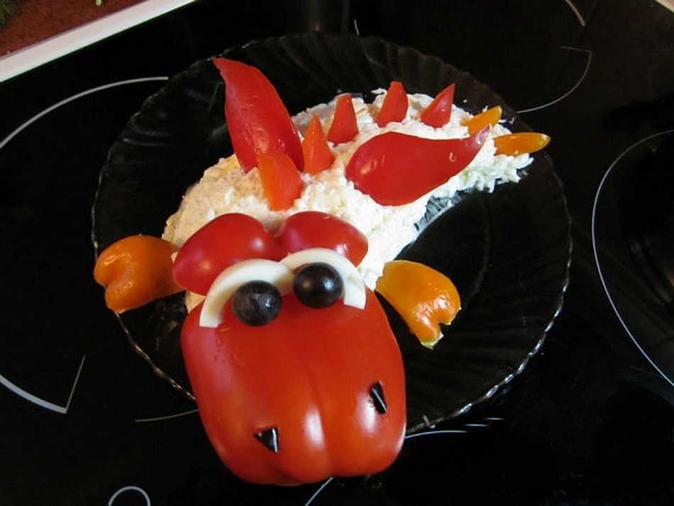 , к примеру — дракона. Это особенно актуально в год Дракона по восточному календарю или к вечеринке в определенном средневековом стиле. Из болгарского перца легко вырезать форму мордочки дракона, его шипы на спине, крылья и лапки. Глаза и некоторые точные детали можно вырезать из маслин.