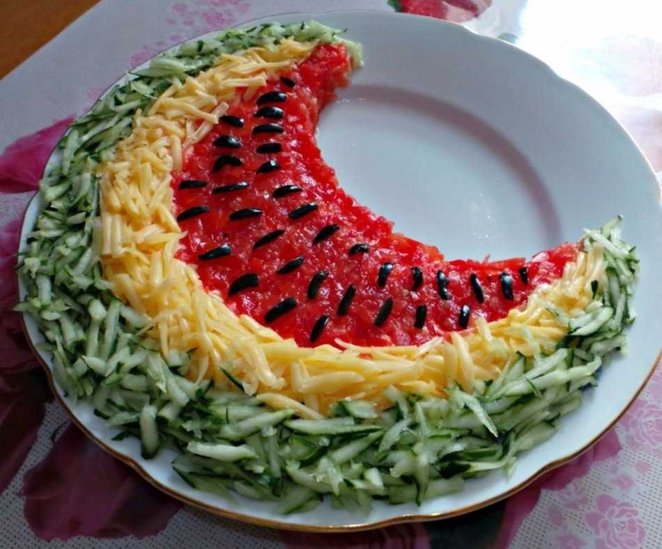 Для структурирования информации, поданной выше, стоит посмотреть на уже готовые композиции, после разобрав их на составляющие. Это поможет вам самостоятельно выполнить украшение блюда. Простые пошаговые варианты красивого оформления салатов с фото: