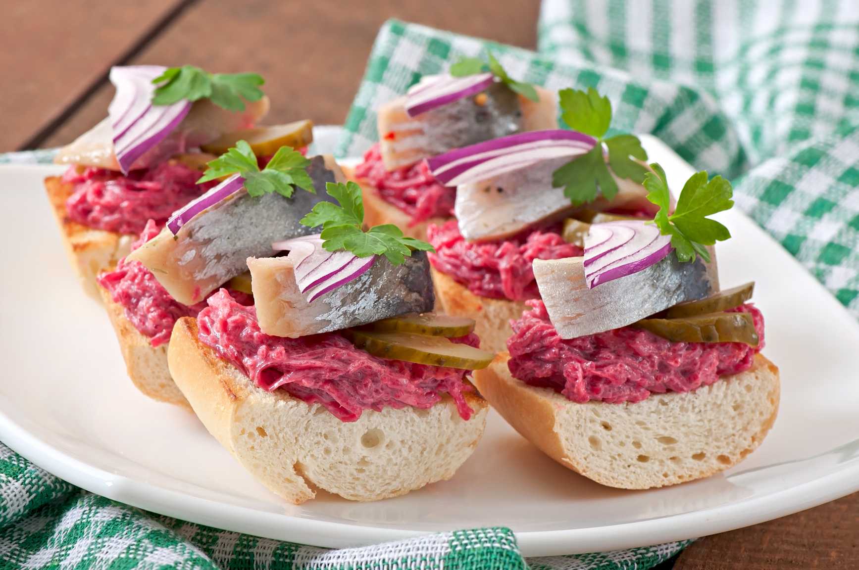 - Черный или белый хлеб нарезать на небольшие кусочки. Каждый кусочек хлеба намазать масляной основой. После чего положить на него кружочек помидора. Селедку следует свернуть колечком, и выложить сверху на помидор. Внутрь колечка положить кусочек соленого огурчика и болгарского перца красного перца. При желании сверху композицию можно украсить петрушкой или укропом.