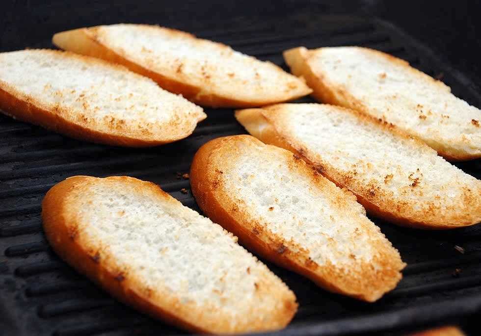 - Хлеб нарезается ломтиками и выкладывается на противень, чтобы слегка подсушить в духовке.