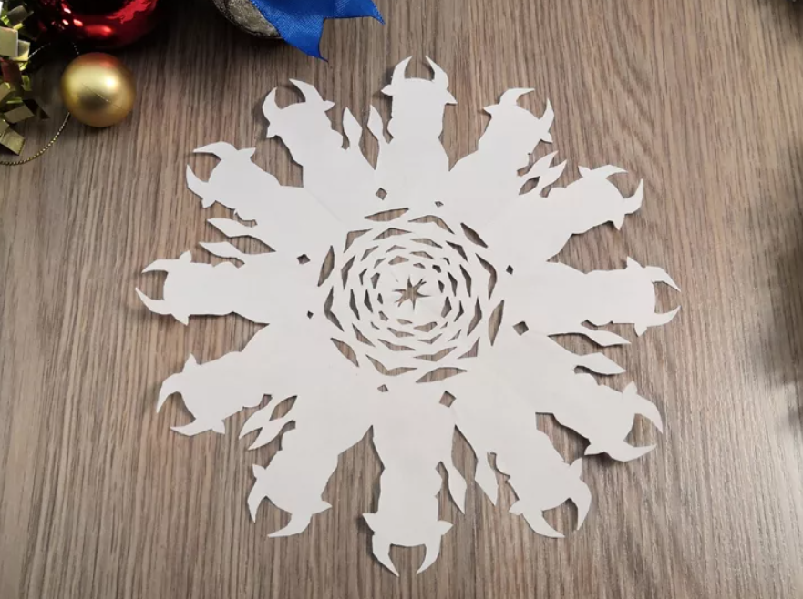 - Верхушку уголка срезаем, все углы аккуратно загибаем к середине. Срезаем верхушку, рисуем на оставшейся части узор. Каким он будет – решать «обитателям» офисного помещения. Актуальная тематика – изображение символа года. А 2021-й будет годом Быка.