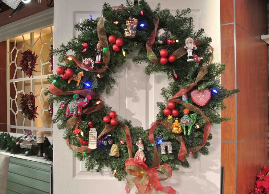 Ничто так не создает атмосферу праздника, как надувные шары и гирлянды. Светодиодная гирлянда станет отличным украшением для дверей. Празднично смотрится и сетка из фонариков и рождественский венок. Остановимся на последнем элементе детально. Для изготовления венка понадобятся: