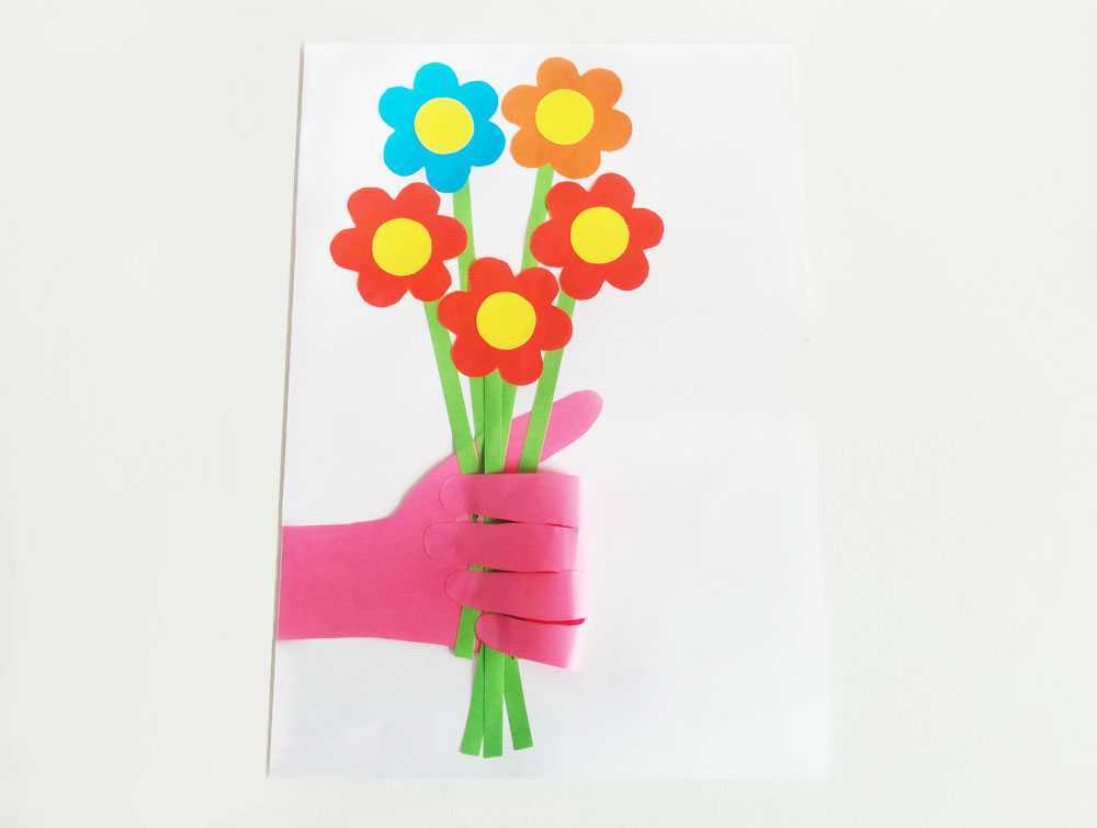 Такую руку ребенок может с юмором преподнести маме — детская ручка буквально протягивает цветок в качестве подарка. Вариации поделки — наклеить на руку два-три цветных сердечка из цветной бумаги или одно большое красное.