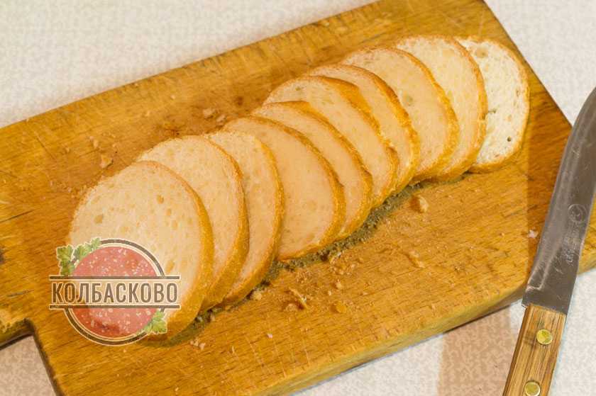 - Разрежьте хлеб (я беру багет) на кружочки толщиной 1 см. Выложите в форму для запекания и дайте ему подсохнуть до состояния гренок;