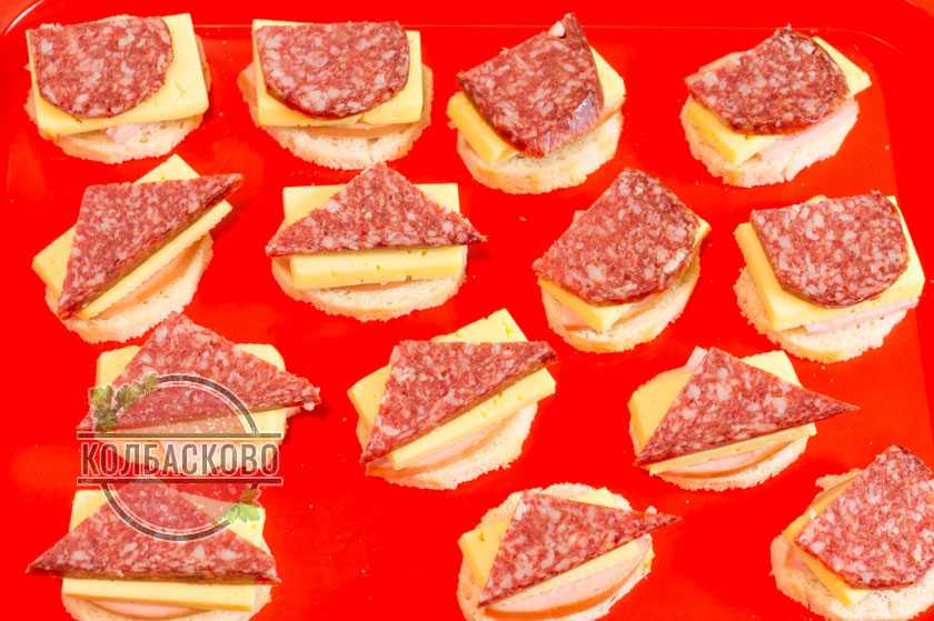 - Намазываем на хлебные кусочки, с одной стороны накалываем колбасную нарезку, затем оливку и закрепляем салями с другой стороны. В итоге, оливка оказывается между колбасы. Хлеб должен быть последним слоем.
