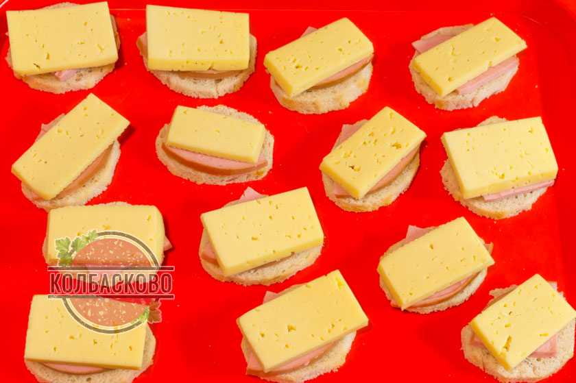 - Нарежьте сыр тонкими ломтиками или вырежьте кружок стаканом того же диаметра, что и хлеб. Достаньте гренки из духовки и остудите их. Положите ломтик сыра поверх гренок для канапе. Если вы не боитесь лишних калорий, гренки можно смазать немного майонезам;