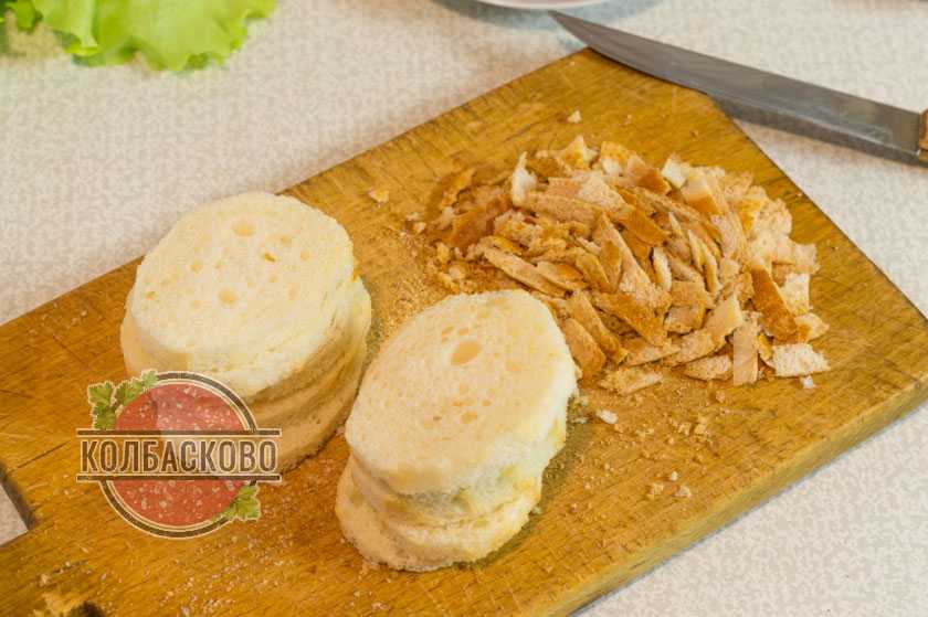 Нарезаем нетолстыми кусочками багет, стаканчиком небольшого диаметра вырезаем мякиш. Слегка подсушиваем его в духовке или микроволновке.