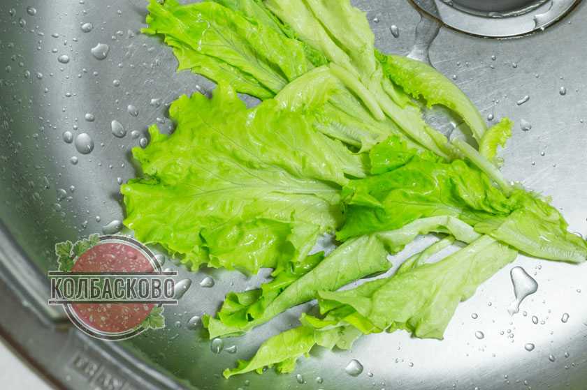 - На ломтик ветчины поместите салатный лист соответствующего размера. Если он будет больше куска ветчины, кухонными ножницами обрежьте до нужного размера.