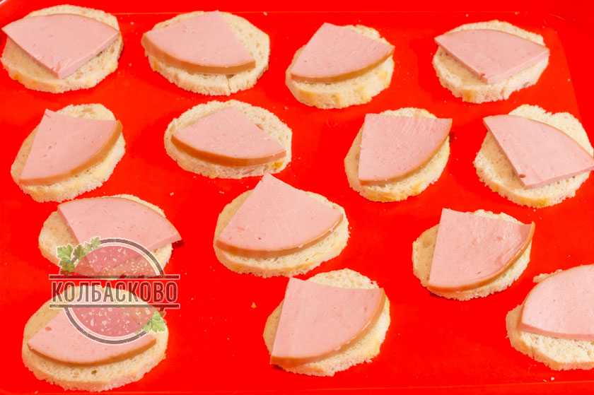 - Сыр с оливками должен оказаться между ветчиной и листьями салата.