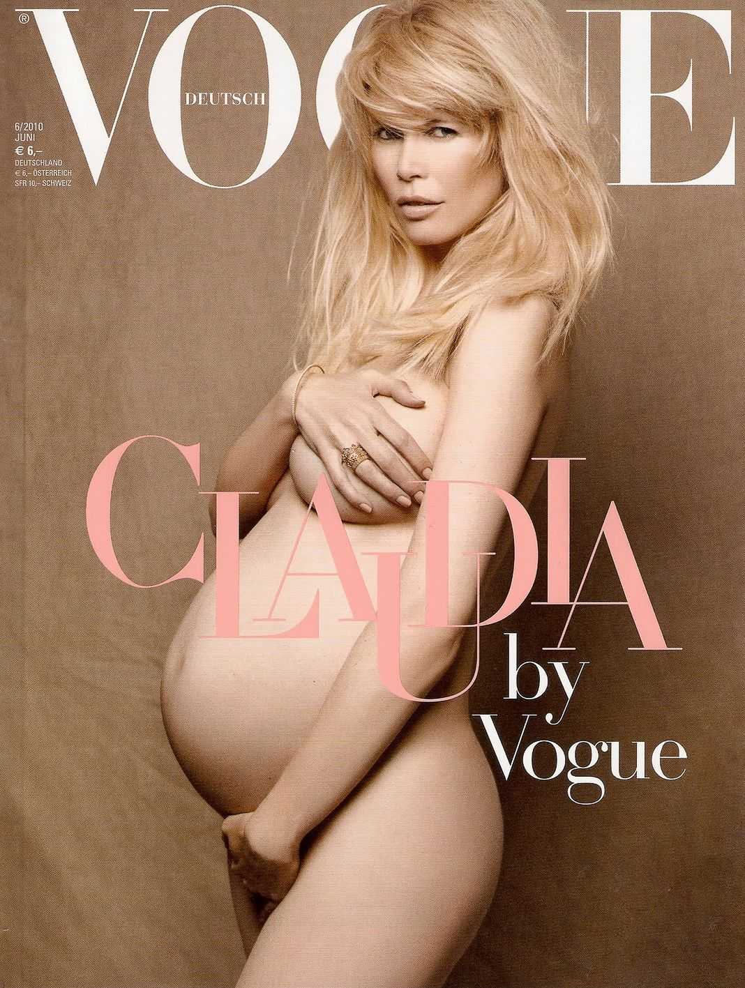 Так, Клаудия появилась на обложке августовского номера журнала Vogue (Италия) абсолютно обнаженной. Интимные зоны модель прикрыла при помощи сумочки и пары туфель. «У этой обложки особенная история. Через 25 лет после моей первой откровенной фотосессии я вернулась сюда», — рассказала Шиффер.