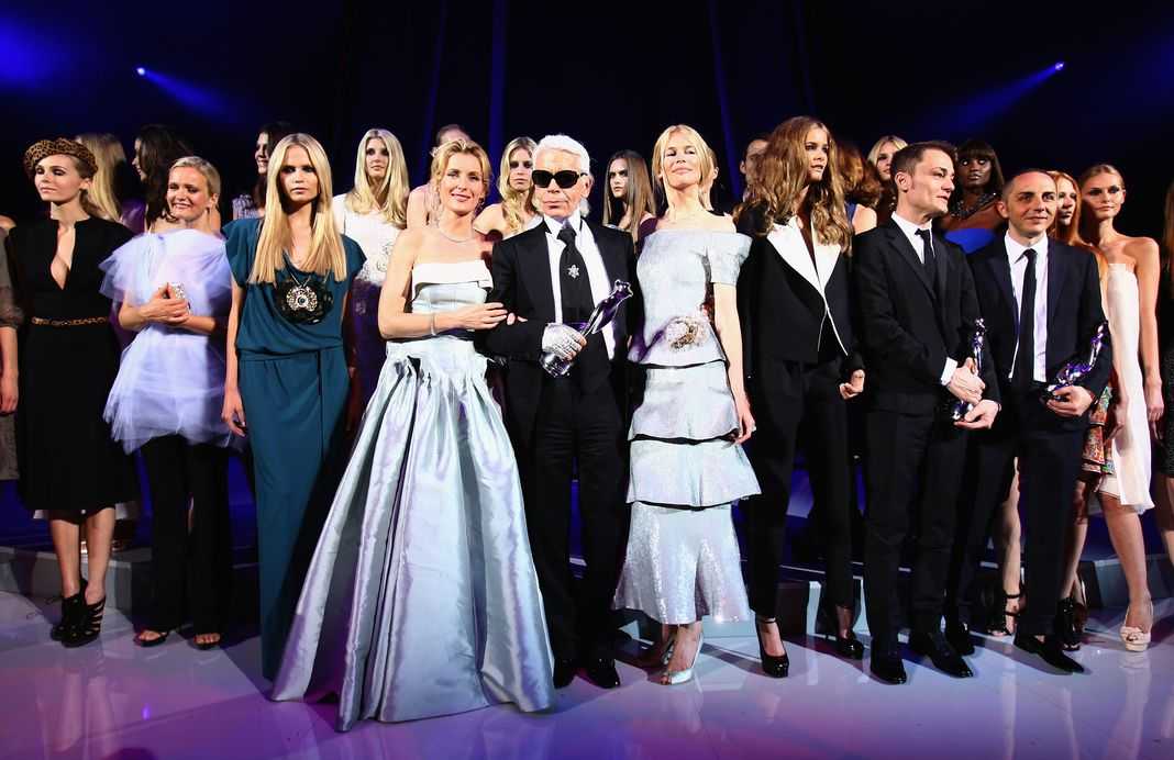Карл Лагерфельд вместе с Марией Фуртвенглер и Клаудией Шиффер на церемонии награждения ELLE Fashion Star в Берлине, 19 июля 2008 г.