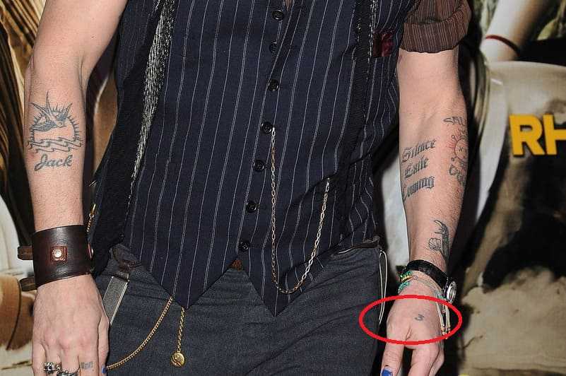 На обеих руках Деппа есть симметричные черно-белые фотографические изображения молодого моряка и его девушки. Видимо, тату означает, что встретиться этой паре не суждено.