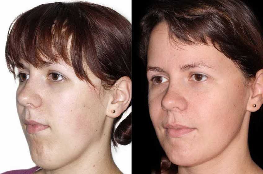 При мезиальном прикусе нижняя челюсть, наоборот, выглядит массивной. Лицо имеет угрюмое выражение. Обычно с таким прикусом двойной подбородок не появляется. После лечения нижняя часть лица остается четко очерченной, но подбородок становится соразмерным.