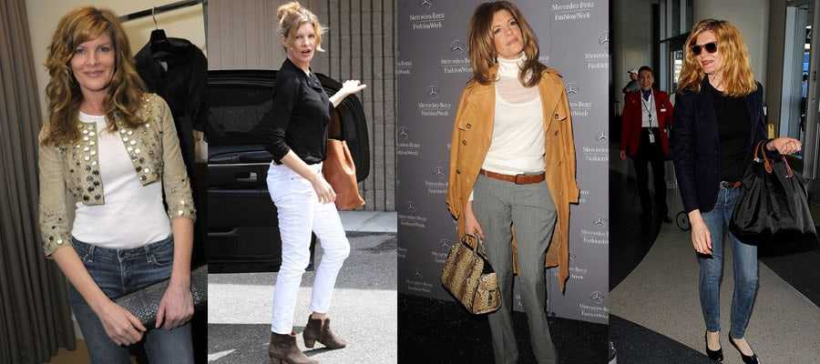 Актриса предпочитает естественность и удобство: туфли, сапоги, балетки на невысоком каблуке, джинсы, комфортный трикотаж. Все силуэты достаточно спокойные, но, тем не менее присутствует умелая игра цвета и формы.