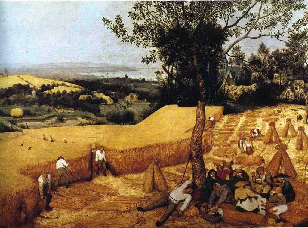Привольно раскинувшийся пейзаж — золотое море пшеницы, деревня и желтые поля вдали — уходит в туманную дымку, к далекому озеру. Это пространство обжито людьми, которые жнут, вяжут снопы, везут огромный воз пшеницы, едят и спят под деревом и там, в деревне, тоже занимаются хозяйственными делами. Брейгель часто бывал в сельской местности и хорошо знал крестьянскую жизнь. Она была для него постоянным источником вдохновения.