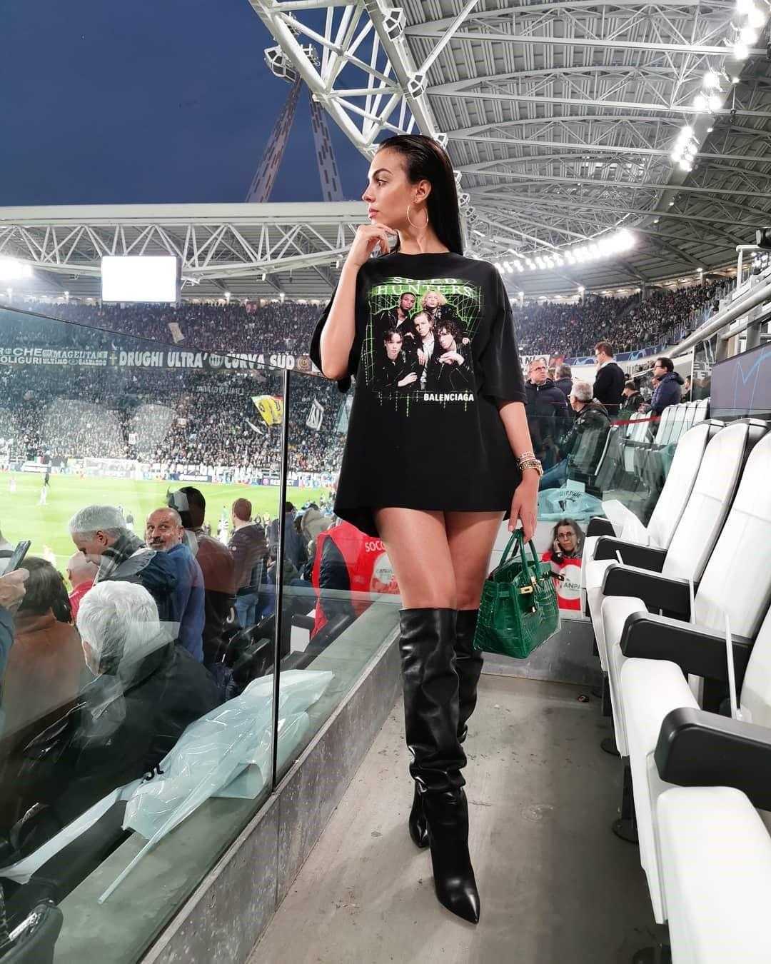 В 2019 году Джорджина поделилась своим снимком со стадиона Ювентус и сразу же набрала более миллиона лайков. И неудивительно: девушка предпочла довольно провокационное сочетание удлинённого лонгслива и высоких сапог.