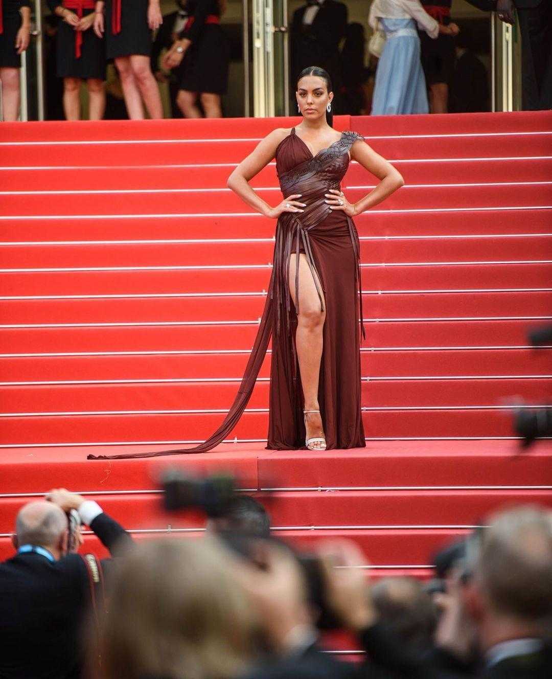 Самый ответственный момент – выход на красную дорожку. В этом году в Каннах Джорджина продемонстрировала весьма необычный образ современной амазонки: кожаное платье от JeanPaulGaultier с высоким разрезом и бахромой она дополнила минималистичными босоножками и «мокрой» укладкой. Получился очень «говорящий» образ с характером.