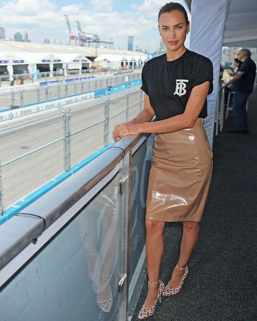 А вот Ирина предпочла куда более сдержанное сочетание кожаной юбки-карандаш и футболки, посещая автогонки формулы Е.