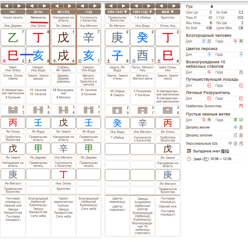 Родительскую семью, отношения с самыми близкими мы можем проанализировать по месячному столпу карты Ба Цзы и по символическим Звёздам «Приют Одиночества», «Сети Небес», «Звезда Банкротства», Куйганг. У Вайноны этот столп представляет собой Агрессивное Самовыражение — Нападение на Власть, модель поведения, мешающая Правильной Власти /образ официального мужа/ закрепить свою позицию в карте Вайноны и в её жизни. Ещё один интересный нюанс — «Сети Небес», в которые вовлечены элементы Сюй /Земная ветвь родительского столпа/ и Хай /Правильная Власть/.