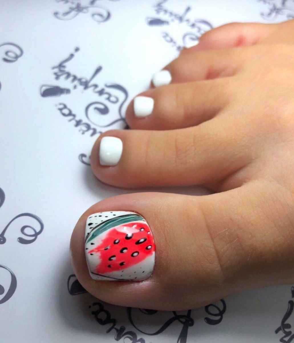 Педикюр с рисунком на большом пальце сможет разнообразить повседневность. Для подобного акцента в маникюре часто выбирается безымянный палец, когда как большой палец в педикюре — главное место для дизайна.