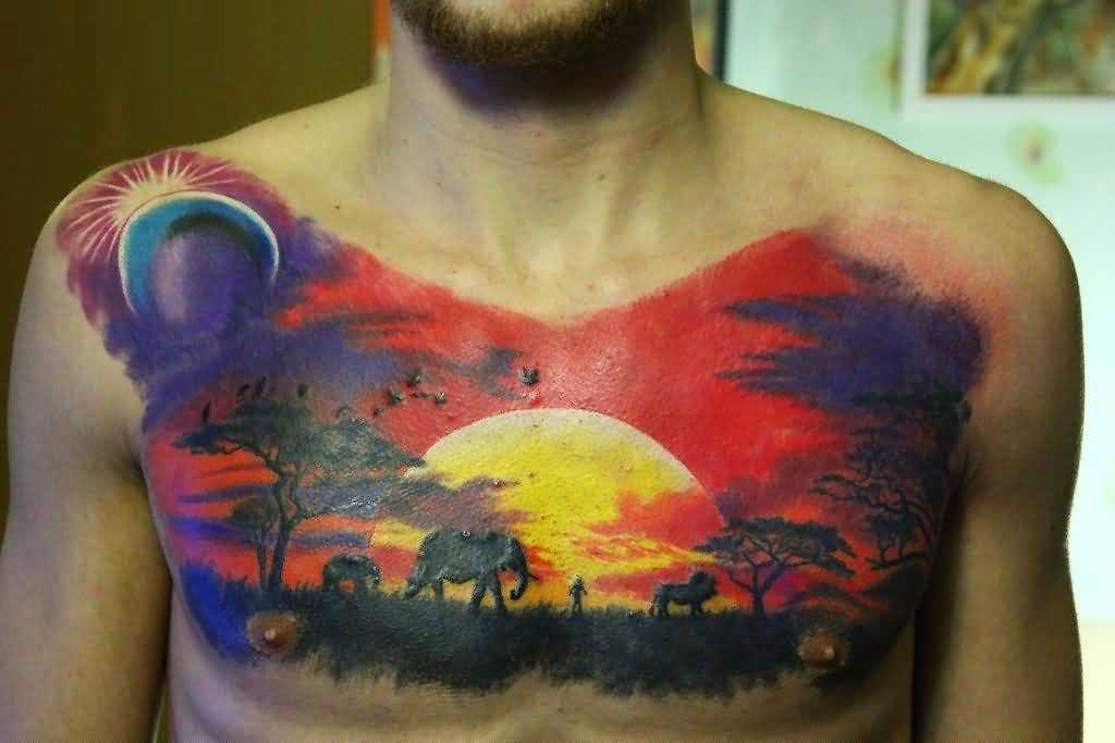 9. Popular Red And Yellow Color Ink Wild African Tattoo With Tree And Elephant