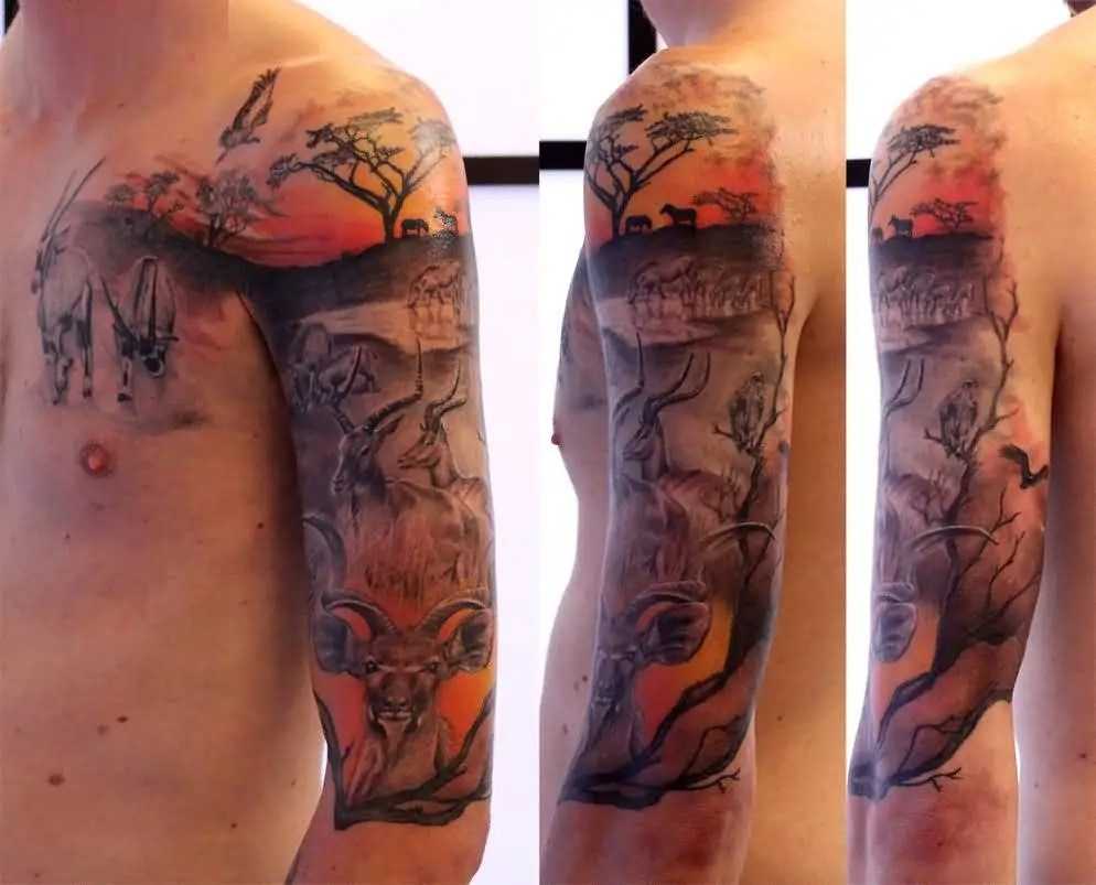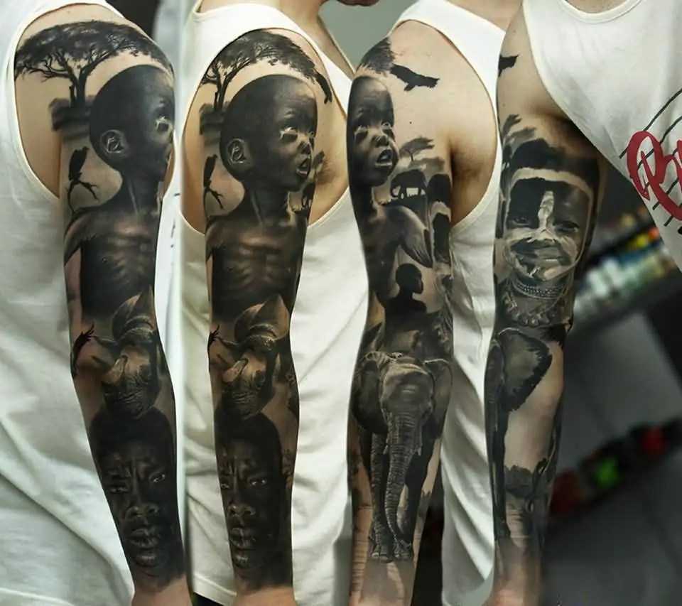 18. Mind Blowing Gray Color Ink African Animal Tattoo With Women Tattoo On Boy Full Arm