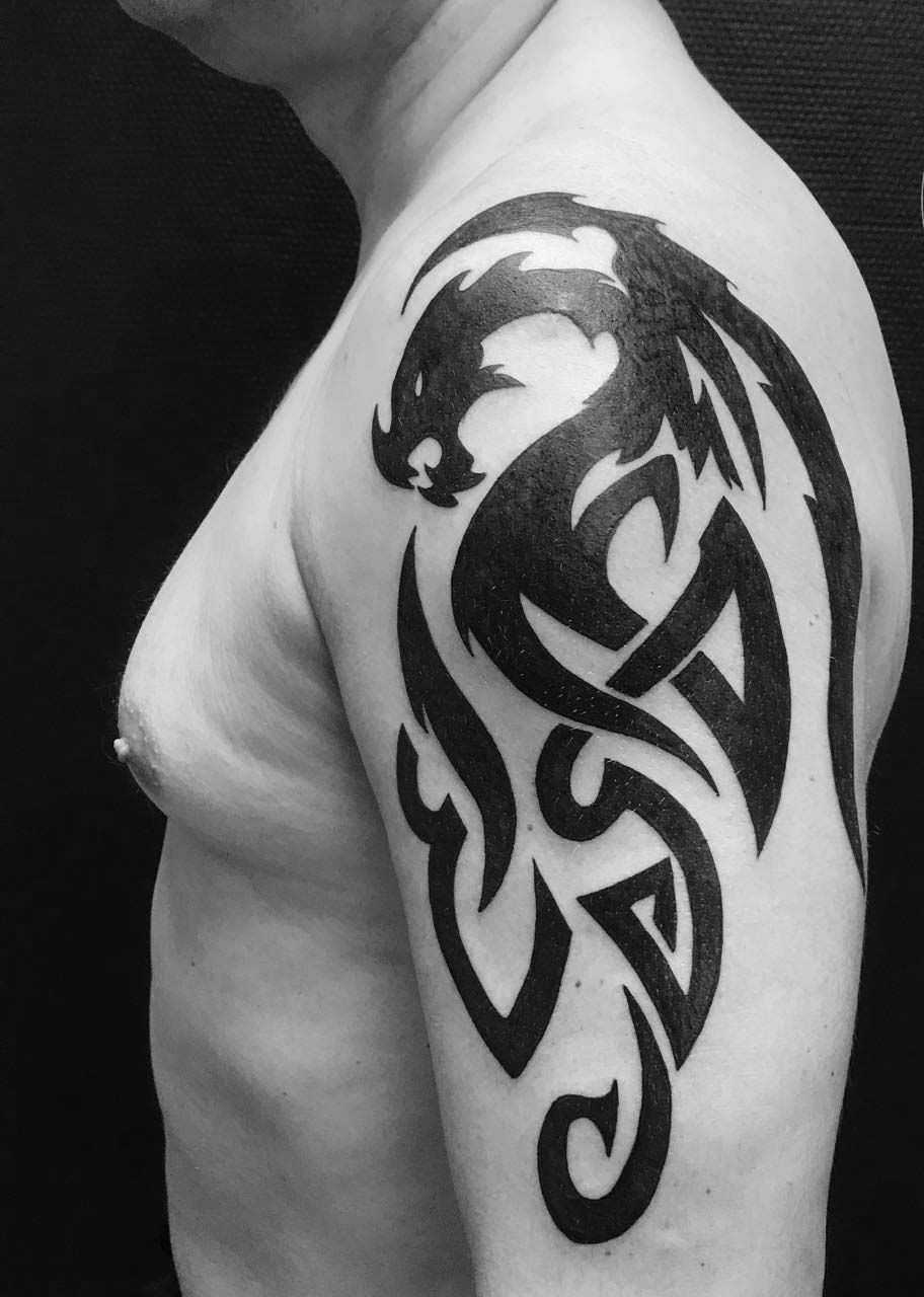 Культовое место занимает дракон в стиле трайбл. Мифическое создание выполняется с раскрытыми крыльями, атакующий и парящий.
