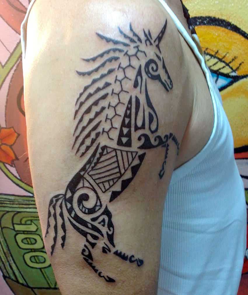 Таким образом, древнейшие народности накладывали на тело эти узоры для равновесия души и тела. Перед нанесением узоров жрец читал молитвы и заклинания, а после, без наркоза, при помощи деревянных палочек краска загонялась под кожу. Боль была невыносимая. Считалось, что тот, у кого есть такой рисунок на теле, вынослив и смел. Благодаря морякам, такой вид татуировок попал и в Европу.