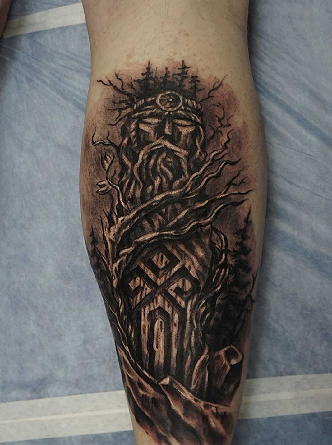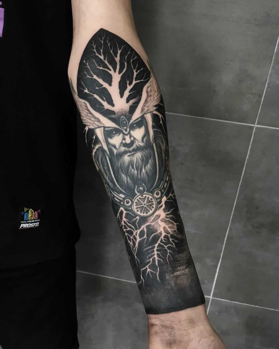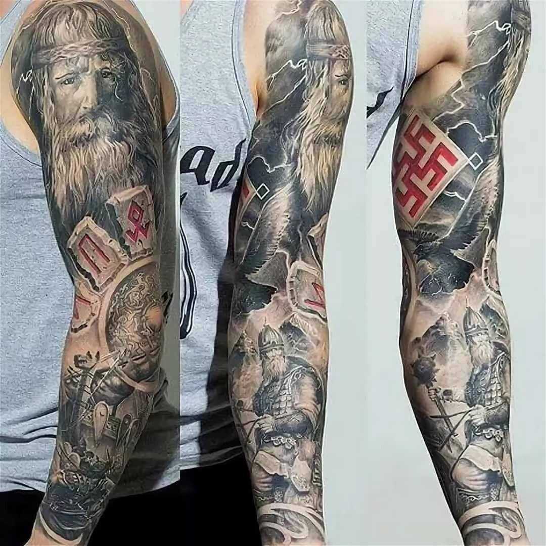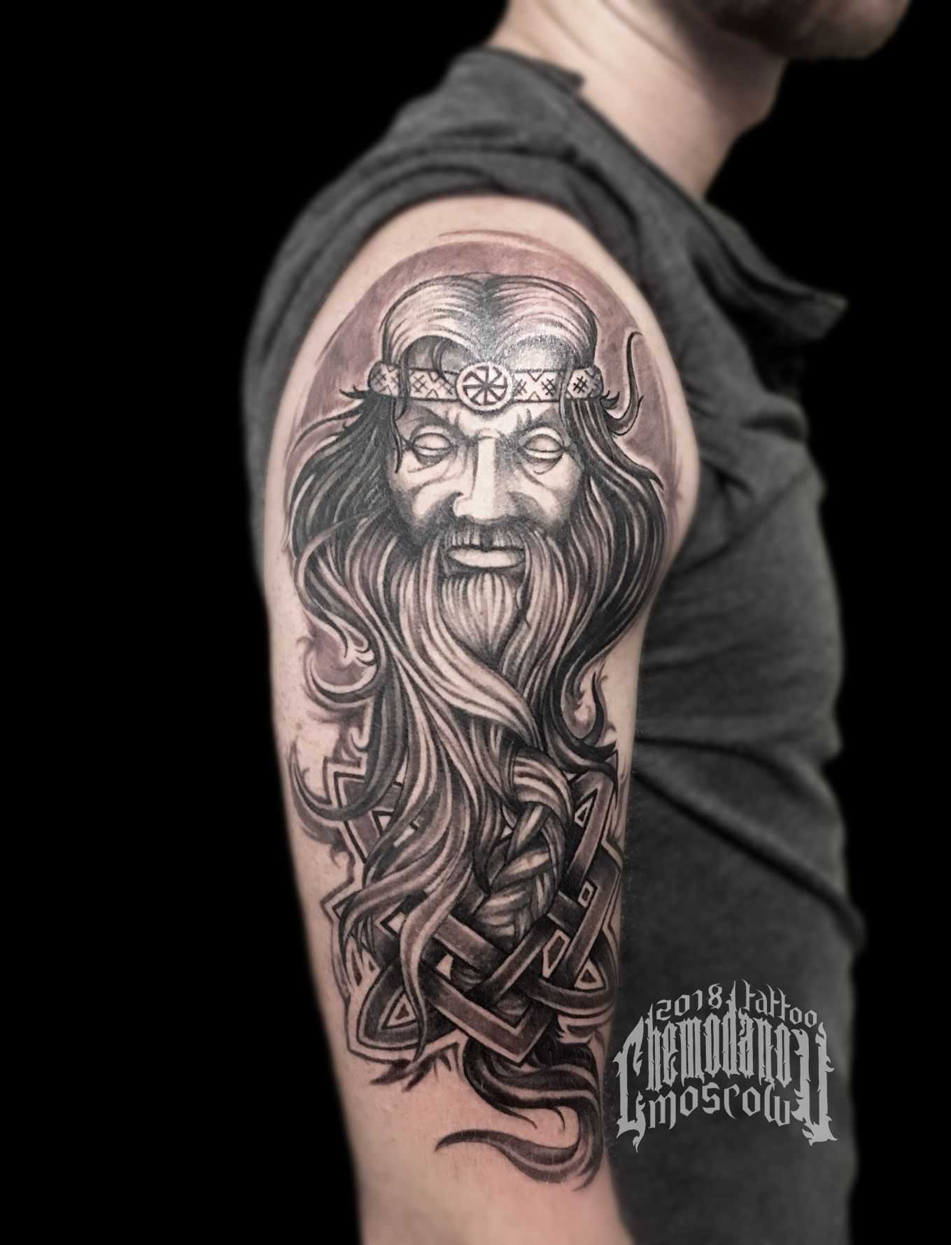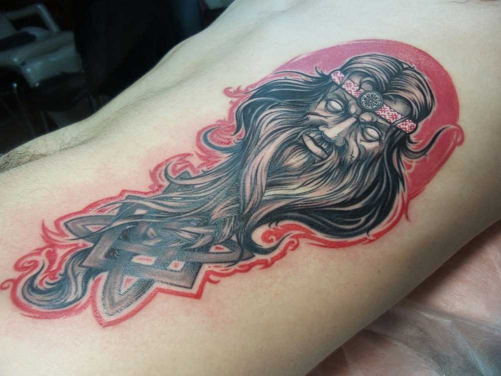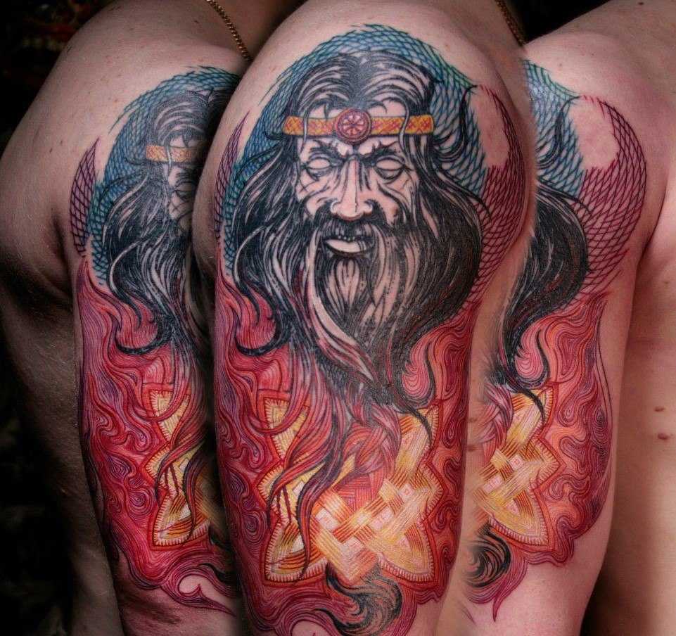 Тату с изображением божества – у славян в древности был большой пантеон богов, напоминающий мотивы скандинавской религии и мифологии. Культура славян и викингов постоянно переплеталась, отсюда появились следующие языческие наколки: